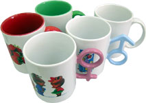 Нанесение любого изображения при помощи термотрансферной бумаги и термотрансферного пресса. Различные варианты кружек: белая с розовой ручкой, белая с голубой ручкой, чисто белая, с цветной ручкой и цветной внутренней поверхностью (голубая, красная, зеленая). Габариты: 80х95 мм. Проиизводство: Таиланд.